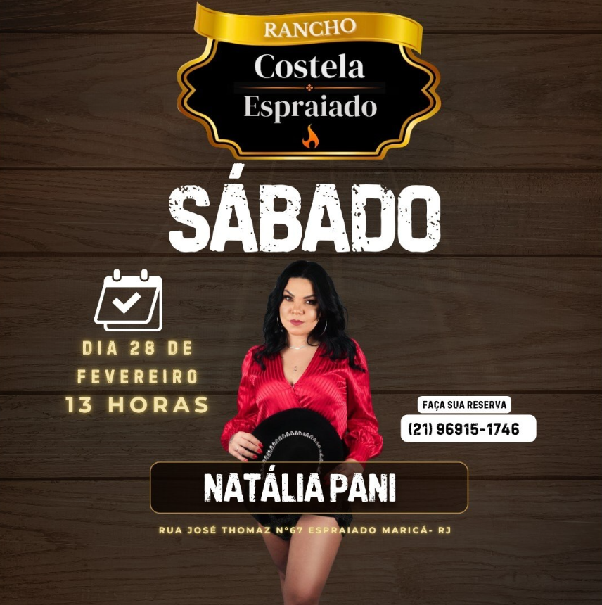 No sábado, 28 de fevereiro, quem sobe ao palco do Rancho Costela Espraiado é a cantora Natalia Pani, trazendo voz marcante, repertório animado e o clima ideal para você curtir um dia especial com a família e os amigos. 🎶🌿