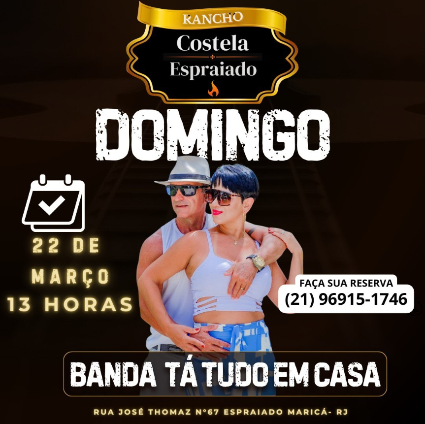 No domingo, dia 22 de março, o clima vai ficar ainda mais animado no Rancho Costela Espraiado com a banda Tá Tudo em Casa, trazendo muita música, energia e aquele repertório perfeito para curtir um dia especial com amigos e família. É o tipo de som que combina perfeitamente com natureza, comida boa e momentos inesquecíveis.