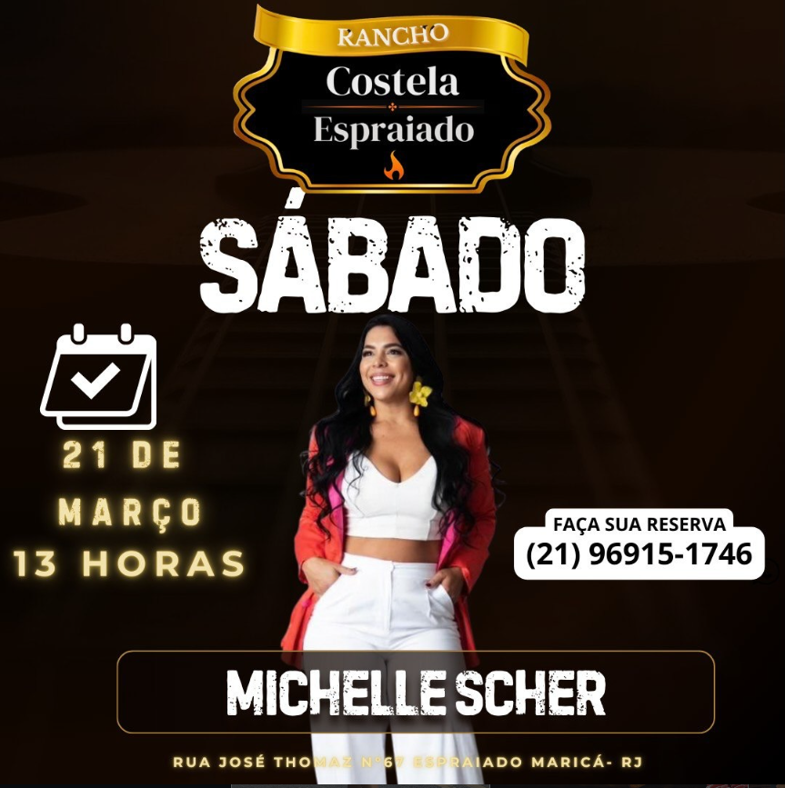 Neste sábado, dia 21 de março, quem comanda o palco do Rancho Costela Espraiado é a cantora Michelle Scher, trazendo um show cheio de energia, boa música e aquele clima perfeito para curtir um dia inesquecível em meio à natureza. É a combinação ideal de música ao vivo, gastronomia da roça e momentos especiais com amigos e família.